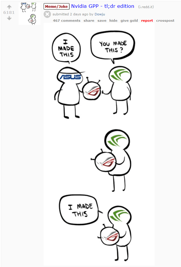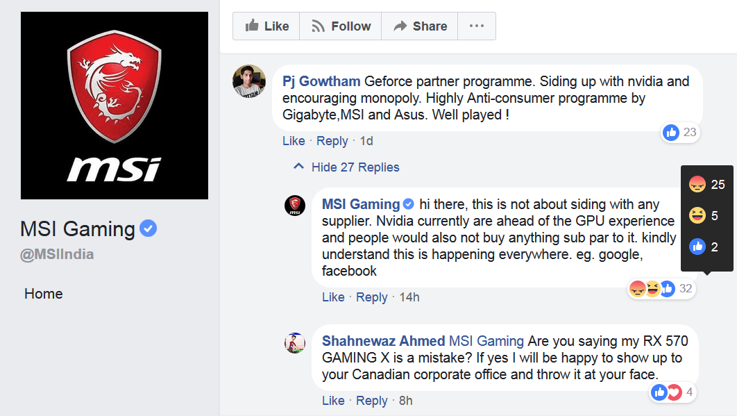 کاربران با کشیدن تصاویر اعتراض آمیز، به محدود سازی کمپانی های تولید کننده کارت گرافیک و تحت فشار قرار دادن شرکت AMD اعتراض کرده اند. هر چند که نباید این مسئله را فراموش کنیم که AMD در سال گذشته اشاره ای سطحی به این مسئله داشته و شاید بنیانگذار اصلی آن خود ای ام دی باشد. به دلیل ناراحتی کاربران از بروز این مسئله، یکی از کارمندان شرکت MSI در هند، به طور شفاف پیوستن شرکت متبوع خود را از برنامه GeForce Partner Program را تائید کرده است! برخی از کمپانی ها از جمله ایسوس، ام اس آی و گیگابایت بیشترین فشار را برای تغییر آرایش خود در این داستان جدید تجربه خواهند کرد.