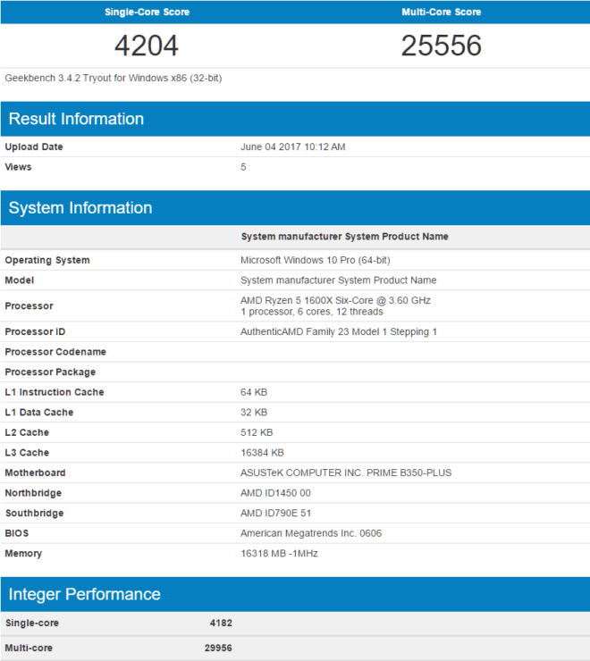 The highest score listing for the Ryzen 5 1600X chip features a score of 5956 points in single and 36061 points in multi-threading. This listing had the Ryzen chip overclocked to 5.4 GHz. A stock configuration yielded scores of 4204 points in the single and 25556 points in the multi-threading tests.
