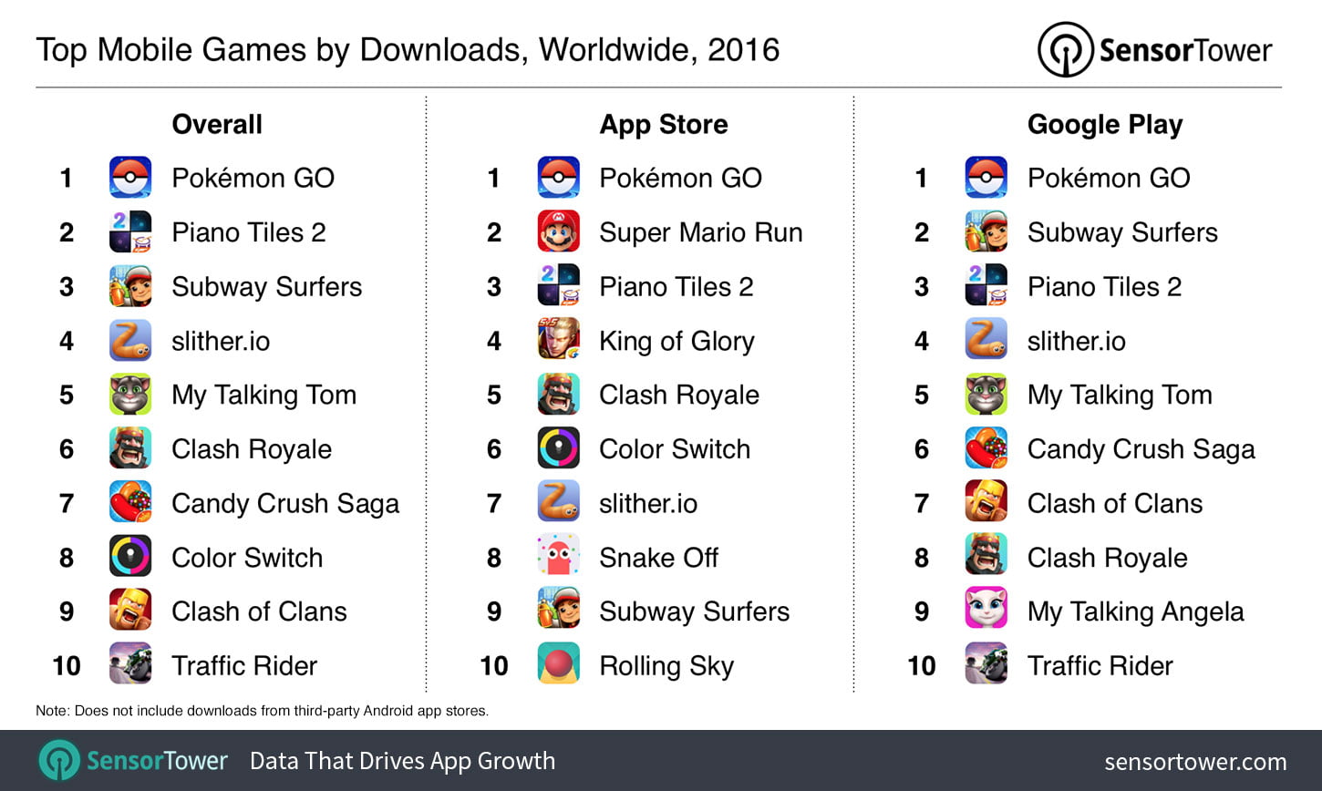 اگر پیگیر خبرهای مربوط به بازی ها و اپلیکیشن های منتشر شده در سال 2016 باشید حتما می توانید به راحتی دانلود شده ترین بازی های سال گذشته را پیش بینی کنید. بر اساس گزارشی که توسط Sensor Tower منتشر شده بازی پوکمون گو در هر دو پلتفرم اندروید و iOS به عنوان دانلود شده ترین بازی سال شناخته شده است. اما رتبه های دوم در دو پلتفرم متفاوت هستند. در حالی که این عنوان در iOS به سوپر ماریو ران تعلق دارد، Subway Surfers رتبه دوم دانلود شده ترین بازی های اندرویدی را به خود اختصاص داده است. همچنین رتبه سوم نیز در هر دو پلتفرم به Piano Tiles 2 تعلق دارد. اما نکته ای نیز در این بین وجود دارد و آن تعداد کاربران هر یک از این پلتفرم هاست. همان طور که می دانید تعداد کاربران اندرویدی در جهان به مراتب بیش از iOS است و همین باعث تفاوت در رده بندی کلی خواهد شد. در رده بندی کلی بین بازی های دانلود شده در سال 2016، بازی پوکمون گو در مقام اول، Piano Tiles 2 در رده دوم و Subway Surfers در رده سوم قرار دارد.