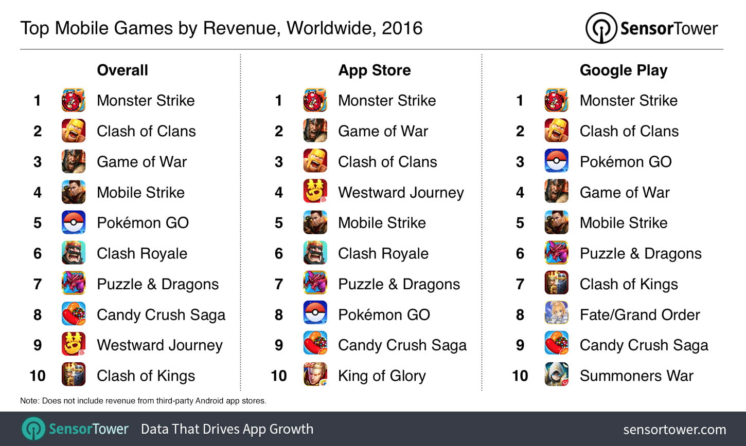 بخش دیگری از این گزارش به پر درآمد ترین بازی های سال گذشته ارتباط دارد. بازی هایی که قابلیت خرید درون برنامه ای در آنها وجود داشته و کاربران می توانند با پرداخت مبالغی به بخش های گسترده تر یا امکانات بیشتری از بازی دسترسی داشته باشند. از این نظر در iOS سه بازی Monster Strike، Game of War و Clash of Clans رده های اول تا سوم را به دست آورده اند و در پلی استور نیز به ترتیب Monster Strike، Clash of Clans و پوکمون گو سه جایگاه برتر را کسب کرده اند. در رده بندی کلی پرفروش ترین بازی ها بدون در نظر گرفتن پلتفرم نیز باز هم Monster Strike در صدر بوده و CoC و Game of War دوم و سوم شده اند.