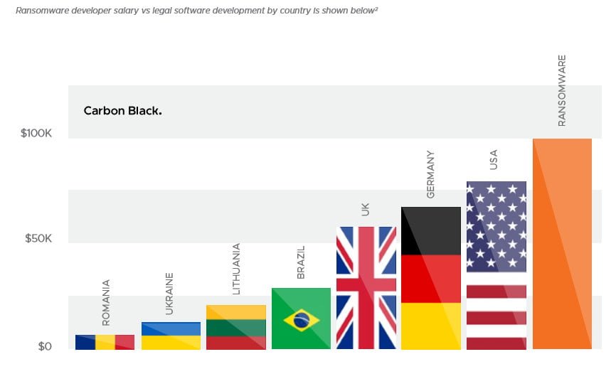 Carbon Black، یک شرکت امنیت سایبری است که توسط اعضای سابق تیم نخبگان دولتی ایالات متحده تاسیس شده و از هکرهای امنیتی تشکیل شده است. این شرکت امنیتی اخیراً گزارشی را منتشر کرده است که نشان دهنده میزان افزایش تأثیرات ransomware یا باج افزار است. به طور کلی بر اساس تخمین ها، باج افزار ها توانسته اند تا حدود 1 میلیارد دلار فقط در امسال به دست آورد، ضمن اینکه که نیازی به مهارت های تخصصی کامپیوتری ندارند، همچنین به سرعت و بدون دردسر به کار گرفته میشوند.