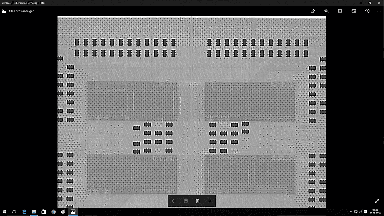 پردازنده ی EPYC از ساختار 4 تراشه (die) با آرایش 2+2+2+2 استفاده می کند و این در حالی است که پردازنده ی  Threadripper 1900X با دو تراشه die از ساختار 4+4 استفاده می کند که این مسئله بدان علت است که کنترلر های حافظه (RAM) و I/O در یک پلتفرم جای گرفته است. تفاوت دوم مربوط به قرار گیری ترانزیستورها در بالای تراشه های است؛ همچنین نامگذاری PCB که در تولید یک برد MCM استفاده می گردد نیز در هر دو پردازنده متفاوت است. تجزیه و تحلیل هر دو پردازنده با دوربین های X-Ray به طور نزدیک تر بررسی شده است؛ اینبار افزون بر جایگاه ترانزیستورهای بالایی، موارد دیگری نیز متفاوت است.