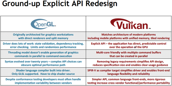 AMD پس از فراز و نشیبی که از سال 2013 بر سر دستورات کتابخانه ایی خود مانند “Mntel” بود،در نهایت کار بر روی یک رابط جدید با نام “Vulkan” را آغاز کرد.هم اکنون اولین نسخه از این دستور برنامه نویسی در اختیار توسعه دهندگان و برنامه نویسان قرار گرفته است.از سوی دیگر انویدیا نیز به طور رسمی اعلام کرد که کارت گرافیک های مبتنی بر GPU های کپلر و مکسول این برند نیز از Vulkan پشتیبانی خواهند کرد و این مهم از طریق به روزرسانی در اختیار کارت گرافیک های هر دو برند (Nvidia و AMD) قرار خواهد گرفت.