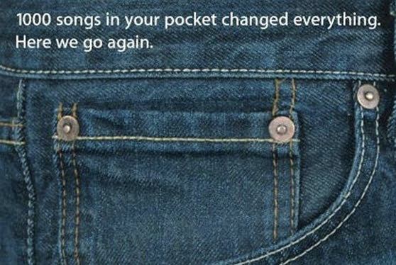 سپتامبر 2005: کسانیکه با شعار اصلی آیپاد آشنا هستند حتما فکر کردند که این دعوتنامه در حال اشاره کردن به جیب جلویی شلوار جین است. اما جیب جلویی نه! زمانیکه استیو جابز مرحوم می خواست آیپاد نانو را رونمایی کند، آنرا از جیب کوچک (جا سکه ای) جلویی شلوار جین خود بیرون آورد.