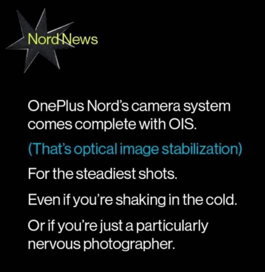 طبق آخرین گزارشی که از طریق مصاحبه با پایه گذار این کمپانی Carl Pei شد مشخص شد که OnePlus Nord با چهار دوربین در پشت دستگاه وارد بازار خواهد شد. دوربین اصلی این دستگاه یک سنسور 48 مگاپیکسلی خواهد بود که وان پلاس آن را با OIS برای ثبت تصاویر بهتر و بدور از لرزش همراه کرده است. در کنار این سنسور، یک دوربین الترا واید با سنسور 8 مگاپیکسل، یک دوربین 5 مگاپیکسل برای عکاسی ماکرو و دوربین 2 مگاپیکسلی برای ثبت عمق تصاویر و کمک به ثبت تصاویر پرتره همگی تشکیل دهندگان دوربین پشت دستگاه هستند.