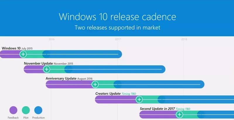 تابستان سال 2016، مایکروسافت از برنامه خود برای دو آپدیت بزرگ ویندوز 10 خبر داد. اما از زمان دقیق آپدیت دوم هرگز سخنی به میان نیاورد. در حالیکه بروزرسانی بزرگ اول، Creators Update به صورت آزمایشی در اختیار کاربران ویندوز اینسایدر قرار دارد، انتظار میرود که این آپدیت در ماه آوریل (فروردین و اردیبهشت) در اختیار در معرض استفاده عموم قرار گیرد. اما همچنان زمان دقیق دومین آپدیت ویندوز 10 روشن نیست.