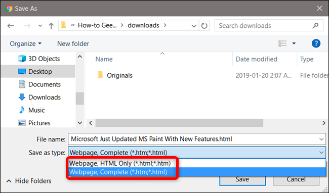 سپس باید یک پوشه یا یک مسیر را برای ذخیره سازی این صفحه انتخاب کنید و در مرحله بعد از بخش Save as type گزینه مورد نظرتان را انتخاب کنید. شاهد دو گزینه خواهیم بود که یکی فقط صفحه HTML سایت را ذخیره می کند و دیگری صفحه وب مورد نظر را به طور کامل ذخیره خواهد کرد. در نتیجه بهتر است تا گزینه دوم یعنی Webpage, Complete را انتخاب نمایید. در واقع انتخاب گزینه دوم کمک می کند تا دسترسی کامل به صفحه را به صورت آفلاین داشته باشید.