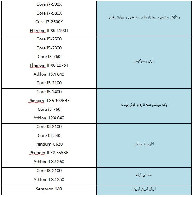 اینکه چی بخرید، به نوع کار شما بستگی دارد. بازی، کارهای خانگی، تماشای فیلم، امور اداری، پردازش و بسیاری امور دیگر هر یک به سیستمی خاص خود نیاز دارند. در ضمن لازم نیست، حتماً قویترین سیستم موجود را برای انجام یک کار ساده یا حتی بازی انتخاب کنید. جدول زیر به شما میگوید، کدام پردازنده برای شما مفید خواهدبود. با تمام این اوصاف، انتخاب پردازنده نهایی به جیب شما نيز مربوط ميشود و ممکن است در نهایت به جای خرید یک پردازنده ششهستهای گرانقیمت از اینتل، یک Phenom II ششهستهای را برای پردازشهای سهبعدی خود در نظر بگيريد.