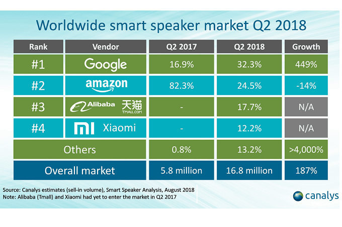یکی از دلایل بالا رفتن درصد فروش گوگل و آمازون، ارائه ی اسپیکرهای هوشمند با کاهش 30 درصدی قیمت است که نظر بسیاری را به خود جلب کرده و موجب فروش 16.8 میلیون اسپیکر هوشمند در سه ماه شده است. در واقع فروش اسپیکرهای هوشمند در این سه ماه 187 درصد رشد داشته است.