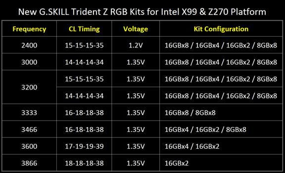 در کیت های 128 گیگابایتی که از ماژول های 16 گیگابایتی استفاده شده است نیز فرکانس 3333 مگاهرتز در تایمینگ CL16-16-18-38 ایجاد خواهد شد. دو کیت با ظرفیت های 64 و 32 گیگابایت برای پلتفرم های Z270 در نظر گرفته شده است. همانند گذشته، جی اسکیل تصاویری از فعالیت این کیت منتشر کرده است که در آن از پردازنده Intel Core i7-6800K در کنار مادربرد  ASUS X99-Deluxe II استفاده شده است. تمامی کیت ها از پروفایل اورکلاک XMP 2.0 پشتیبانی کرده و در ماه مه راهی بازار های جهانی خواهند شد.