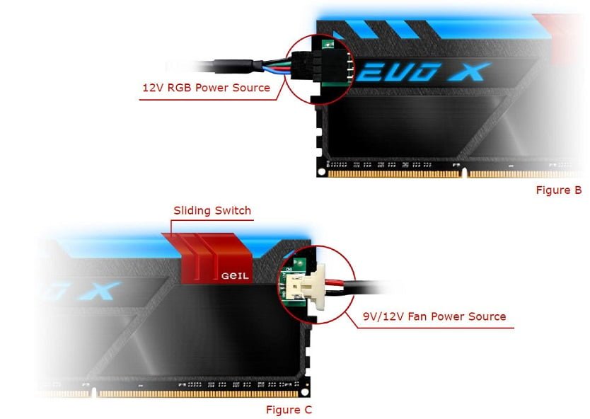 سری جدید حافظه های رم Geil با نام EVO-X در استاندارد DDR4 بوده و به آخرین فناوری های Geil مجهز گشته است.همانطور که می دانید،ولتاژ مصرفی حافظه های رم مابین 1.2 ولت الی 1.35 ولت است.در نتیجه نمی توان چندان بر روی دیودهای نورانی مانور داد.اما Geil اینبار یک راه حل دیگر را در پیش گرفته است.این محصول از یک قطعه ماژولار بهره برده است.این قطعه ماژولار با نام (HILM) یک کیت RGB LED است که بر روی حافظه های رم نصب می گردد.ولتاژ مصرفی این حافظه ها،12 ولت است.یک سوکت در کنار HILM قرار دارد که ارتباط آن با منبع تغذیه (PSU) را امکان پذیر می کند.علاوه بر آن،می توان ورودی برق را به مادربردهایی که از سوکت های 12 ولت بر روی PCB بهره می برند متصل نمود.