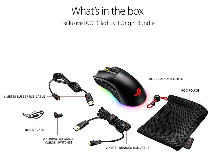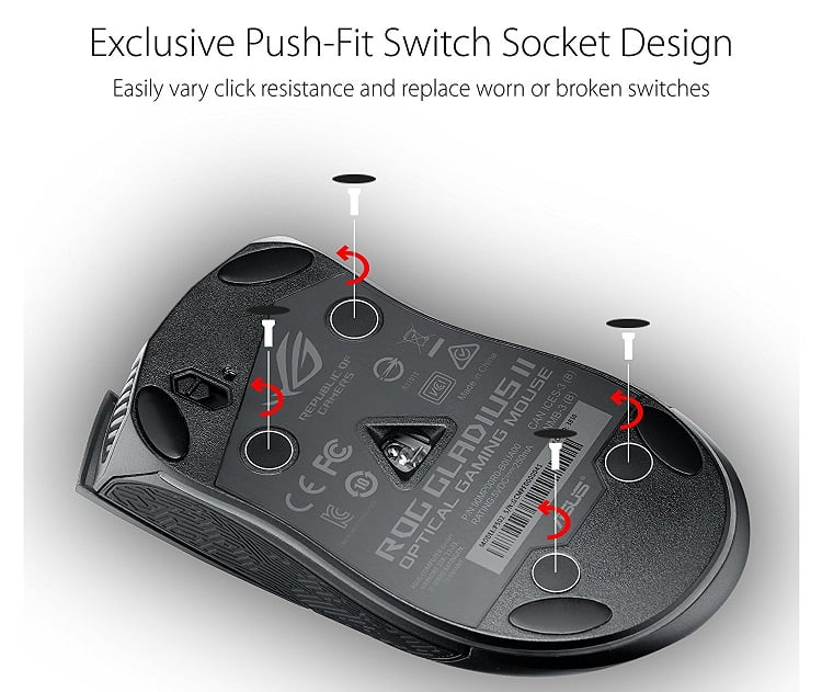 میکروسوئیچ های استفاده شده در Gladius II از مدل های Omron D2FC-F-K و Omron D2F-01F هستند که دارای طول عمر بالا و صدایی پایین است. یکی از ویژگی های این ماوس، امکان جداسازی رابط اصلی از ماوس است. همچنین استفاده از دیودهای LED RGB نیز یکی دیگر از ویژگی های این محصول است که با فناوری اختصاصی این شرکت با نام ASUS Aura Sync نیز سازگار است. به منظور افزایش کارایی، ایسوس پشتیبانی از نرم افزار ASUS Armoury را نیز امکان پذیر کرده است.