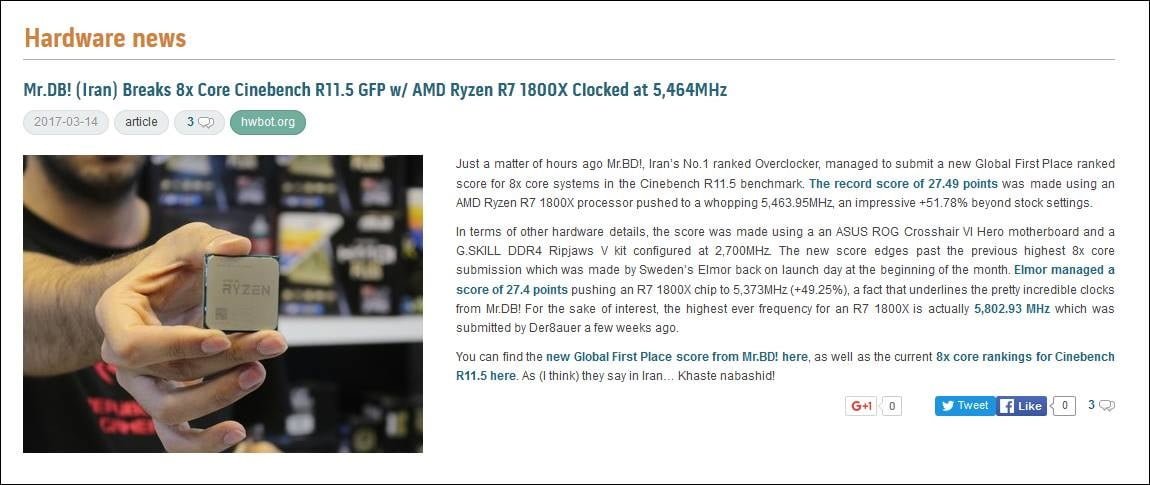 در انتها، نوبت به بخش غافلگیرکننده رونمایی رسید! رکورد جهانی Cinebench R11.5 با استفاده از مادربورد ROG CROSSHAIR VI HERO و پردازنده AMD Ryzen R7 1800X  در فرکانس باورنکردنی 5,469.95MHz در سایت Hwbot.org شکسته شد که در حال حاضر یکی از مهمترین رکوردهای ثبت شده مرتبط با پردازنده در جهان است.
