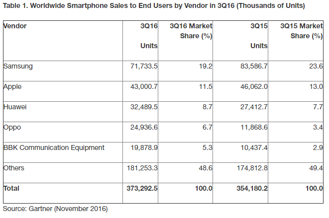 هر چند سامسونگ بزرگترین سقوط در سهام فروش سالیانه ی خود را در تمام تاریخ کمپانی تجربه کرده است و سهم کمپانی از 23.6 در صد به 19.2 در صد کاهش پیدا کرده است. در عین حال میزان فروش کمپانی نیز در سه ماهه ی گذشته نسبت به همین مدت زمان از سال 2015 حدودا 14.2 در صد کاهش پیدا کرده است تا در این قسمت نیز سامسونگ بدترین رکورد خود را به ثبت برساند. همان طور که در بالا عنوان شد، گلکسی نوت 7 اصلی ترین دلیل این آمار منفی برای سامسونگ است. این دستگاه نه تنها هیچ سودی را برای کمپانی به دنبال نداشت، بلکه تمامی هزینه های فراخوانی و پرداخت خسارت به کاربران نیز به ضرر سازنده ی کره ای تمام شد. اما از سوی دیگر به نظر میرسد کاربران حساسیت زیادی به قیمت گوشی های هوشمند نشان میدهند و به همین دلیل شاهد افزایش فروش سازندگان چینی گوشی های هوشمند نیز هستیم. با نگاهی به جدول زیر میتوانید رشد نسبی سهام سازندگان چینی از جمله هواوی، اوپو و BBK Communication Equipment را مشاهده کنید. روی هم رفته این سه کمپانی چینی، 21 در صد از عرضه ی گوشی های هوشمند در سه ماهه ی سوم 2016 را از آن خود کرده اند و تنها این سه کمپانی از بین 5 سازنده ی برتر، موفق به افزایش فروش محصولات و سهم خود در بازار رقابت شده اند.