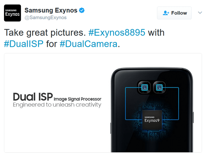 بدین منظور اکانت توئیتر “سامسونگ اگزینوس” تبلیغی را در مورد چیپست اگزینوس 9 انجام داده است که از پشتیبانی این چیپست از دوربین های دوگانه خبر میدهد. سامسونگ قصد استفاده از چیپست اگزینوس 8895 را که در گروه اگزینوس سری 9 قرار میگیرد در گلکسی اس 8 و اس 8 پلاس ( در اکثر مناطق ) دارد بنابراین امکان تجهیز شدن این دو مدل به دوربین های دوگانه وجود دارد. هر چند در تصاویر و ویدئوهایی که تاکنون از پرچمداران معرفی نشده ی سامسونگ منتشر شده، خبری از دوربین دوگانه در پشت دستگاه نبوده است. بنابراین شاید امکان استفاده از دوربین دوگانه در گلکسی نوت 8 بیشتر باشد. اگزینوس جدید از سنسور پردازشگر تصویر دوگانه پشتیبانی میکند که وظایف مختلفی از جمله فوکوس خودکار، تنظیم نور خودکار، HDR، کاهش نویز تصویر و غیره را بر دوش خواهد کشید. همان طور که در تصویر مشخص است، سنسور های پردازشگر تصویر به صورت مجزا از یکدیگر کار خواهند کرد. همان طور که گفته شد با اینکه امکان استفاده از سنسور دوربین دوگانه در پشت گلکسی اس 8 وجود دارد، اما بعید سامسونگ دست به چنین کاری بزند چرا که اینگونه تغییرات لازمه تدابیری ویژه هستند چرا که طراحی دستگاه را تا حد زیادی تحت تاثیر قرار میدهد و ممکن است این تغییر باب میل کاربران نباشد. از آنجا که سامسونگ با اتفاقی که برای نوت 7 افتاد تنها به یک موفقیت بی دردسر برای گلکسی اس 8 فکر میکند، بعید است با چنین اقدامی خود را وارد چالش کند.
