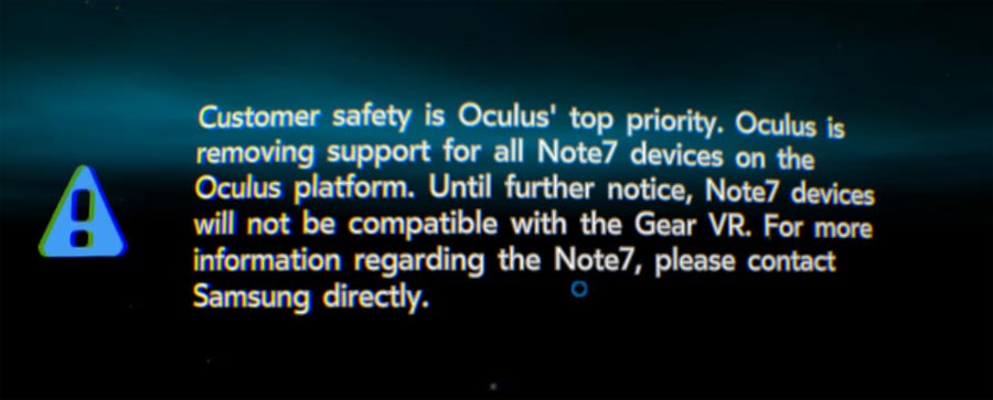 از همین رو سامسونگ و Oculus در آخرین بروزرسانی نرم افزار هدست واقعیت مجازی خود، پشتیبانی از مدل گلکسی نوت 7 را از مدار خارج کرده و کاربران این محصول قادر به استفاده از این هدست نخواهند بود. مبرهن است که دلیل این اقدام جلوگیری از آسیب های انسانی به کاربران است. پس از اتصال گلکسی نوت 7، یک پیغام بدین مضمون رویت می شود: