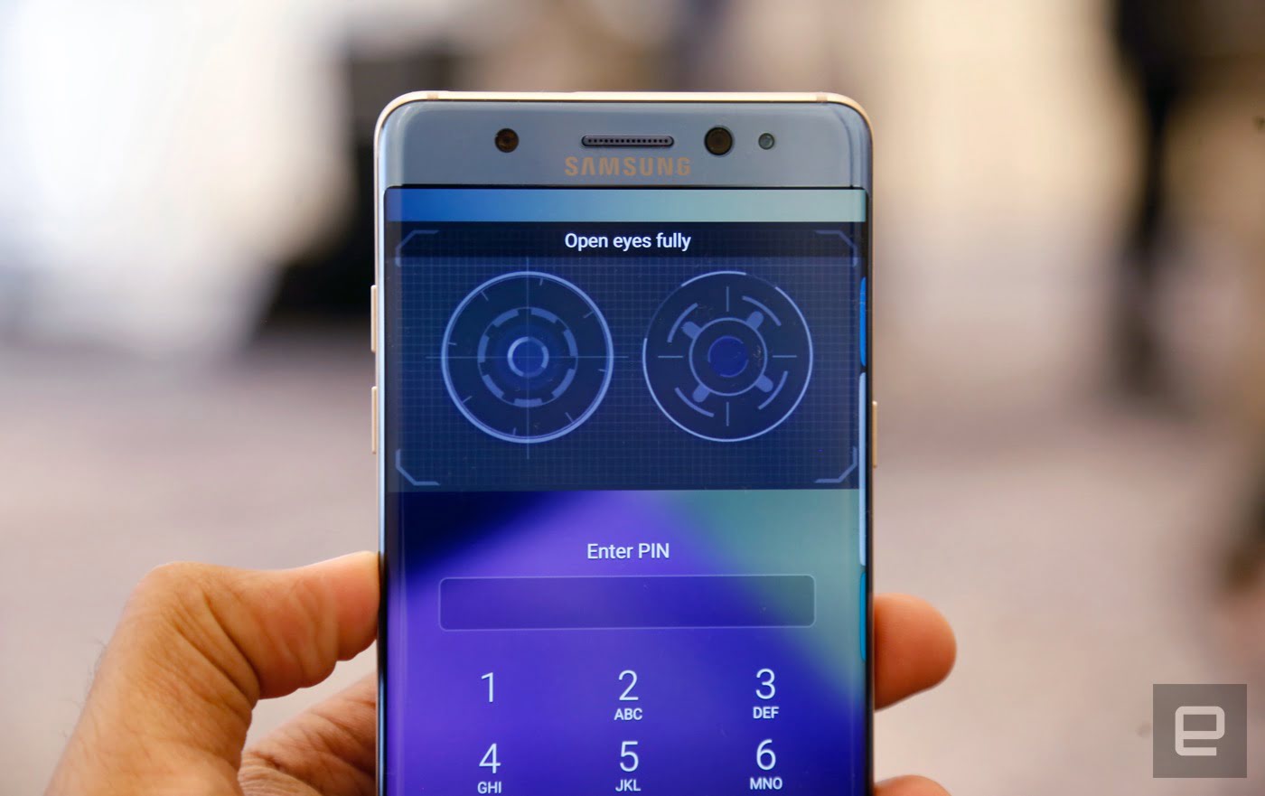 در حالی که از نظر مشخصات فنی گلکسی نوت 7 بسیار شبیه به پرچمداران سری اس کمپانی است، اما برخی ویژگی های جدید به پرچمدار بزرگتر کمپانی اضافه شده است. از بارز ترین ویژگی های جدی نوت 7، اسکنر عنبیه چشم جهت باز کردن قفل دستگاه است در حالی که سنسور اثر انگشت نیز همچنان در دستگاه وجود دارد. این اسکنر مانند اسکنر های موجود در لومیا 950 مایکروسافت توسط مادون قرمز دوربین کار میکند و در ظرایط نور کم نیز عملکرد قابل قبولی دارد. همچنین از این اسکنر میتوان برای باز کردن قفل اپلیکیشن ها، تصاویر، یاد داشت ها و دیگر محتویات یک پوشه ی ایمن شده استفاده کرد.