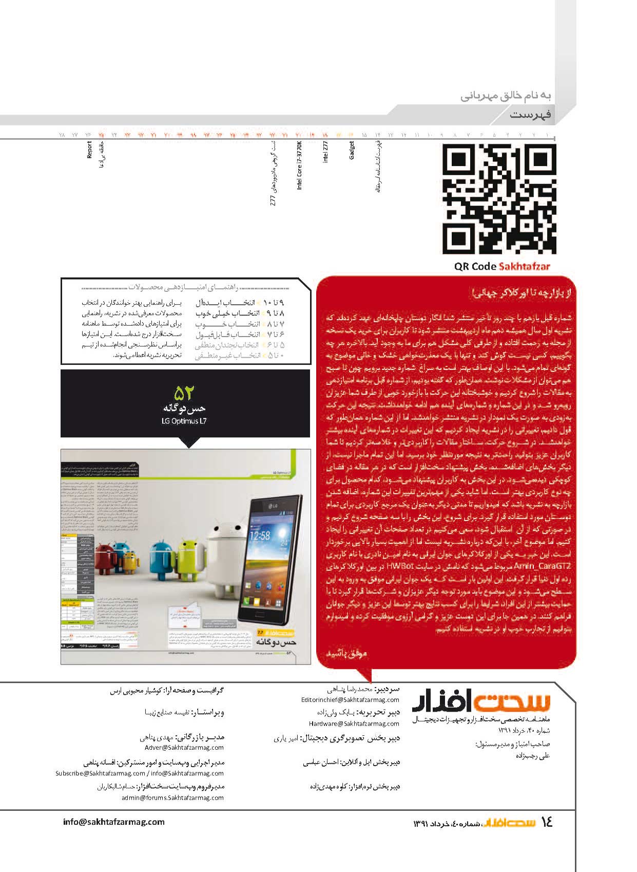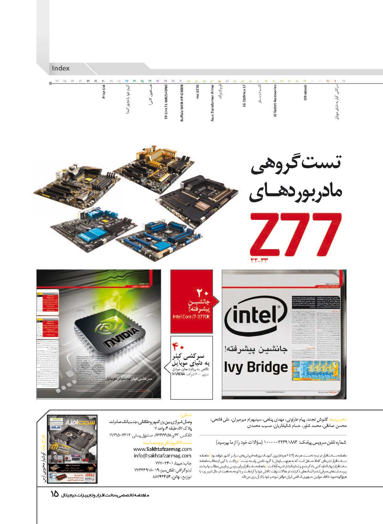 اين هم يک شماره به نسبت موتاسيون پيدا کرده از نشريه! در اين شماره سعي کرديم روند جديد را کمکم وارد نشريه کنيم. در اين روند سعي داريم نظر خودمان را در مورد محصول بيان کنيم در اين حالت شما ميتوانيد در هر مقاله بررسي يک BOX که در داخل آن نوشته شده است پيشنهاد سخت افزار را ببيند که نظر نشريه در مورد محصول است. خوب حال اگر ميخواهيد يک مادربورد Z77 با پردازنده جديد اينتل خريداري کنيد پيشنهاد ميکنيم اين شماره را از دست ندهيد چون کاملترين بررسي مادربوردهاي Z77 و فناوريهاي پردازنده و چيپست جديد اينتل را ميتوانيد در اين شماره بخوانيد.