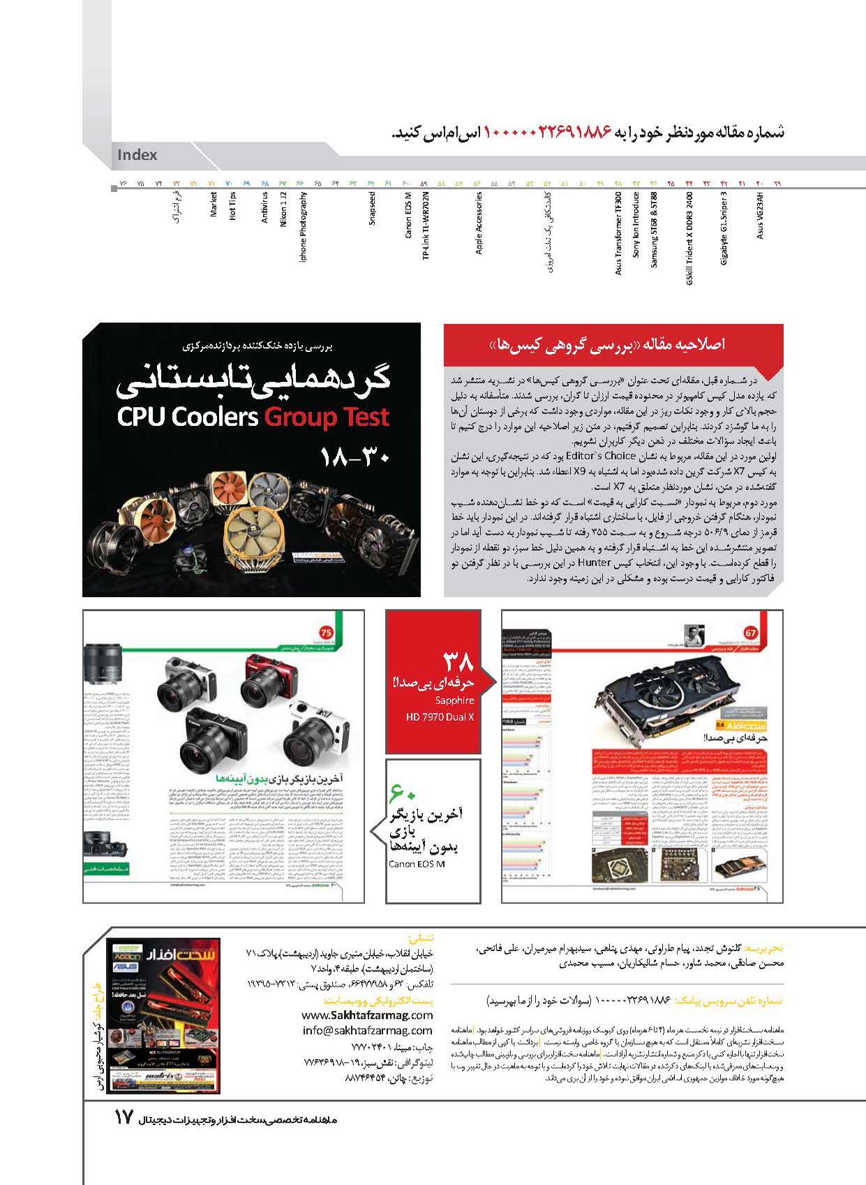 دوستان عزيز اين آخر ماه از تابستان است که در خدمت شما عزيزان هستيم براي همين سعي کرديم با يک بررسي گروهي کامل از خنک‌کننده‌هاي پردازنده در خدمت شما عزيزان باشيم. در اين شماره سعي کرديم با وجود تمامي موارد تنوع مطالب را بيشتر کنيم براي همين بررسي‌هاي متنوعي را در اين شماره خواهيد خواند. همچنين براي کاربران علاقه‌مند به بحث‌هاي نرم‌افزاري هم مطالب خوبي در زمينه نرم‌افزار‌هاي ويرايش عکس، تاريخچه آنتي‌ويروس و ديگر موارد ارده کرديم. اميدوارين اين شماره مانند ديگر شمار‌ه‌ها مورد رضايت شما دوستان قرار گيرد.