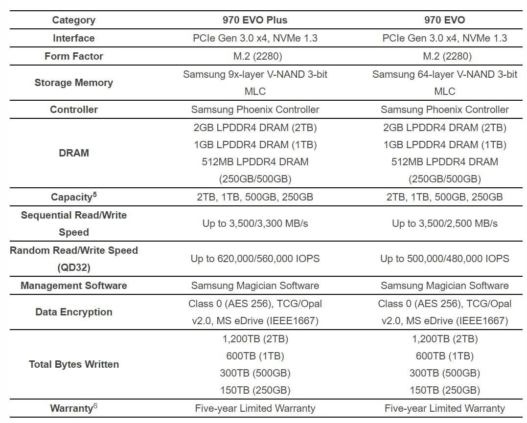سالید های Samsung جدید به باس PCIe Gen3 x4 متصل شده و در نتیجه سرعت خواند و نوشتن در آنها به حداکثر 3500 و 3300 مگابایت در ثانیه می رسد. سیستم رمزنگاری AES 256 و برنامه نرم افزاری اختصاصی Samsung Magician از جمله دیگر ویژگی های سری Samsung 970 EVO Plus به شمار می روند. سالید های Samsung 970 EVO Plus در تاریخ آوریل سال 2019 راهی بازارهای جهانی خواهند شد. در جدول زیر می توانید دیگر مشخصات اصلی این محصولات را مشاهده نمایید.