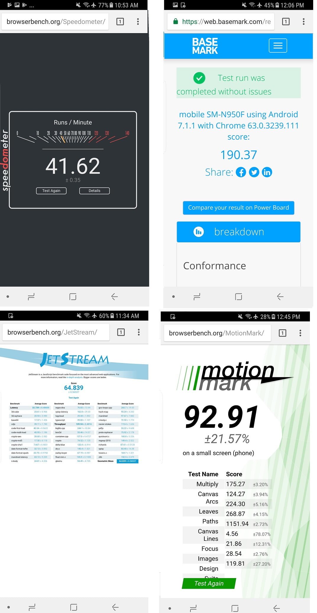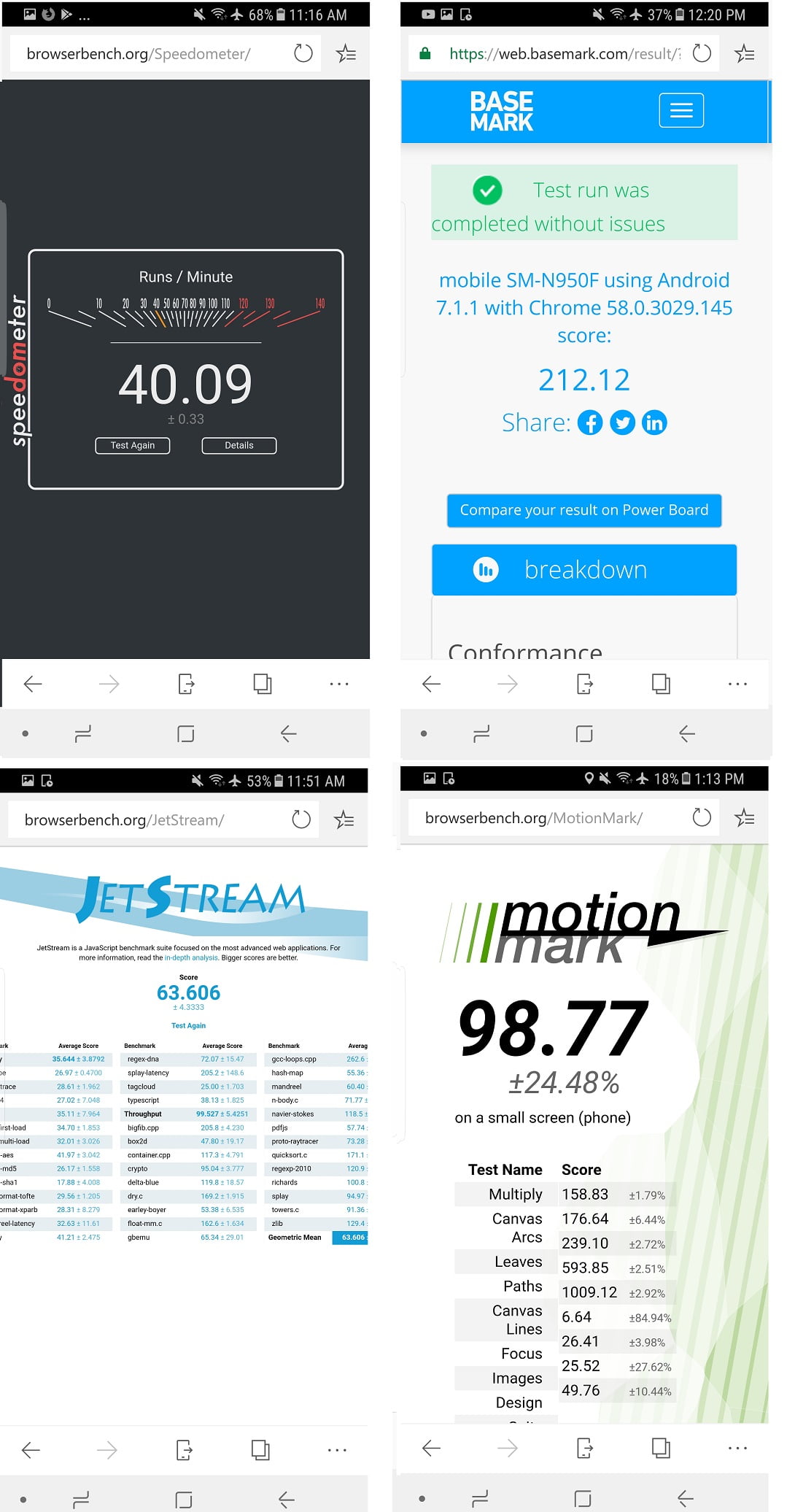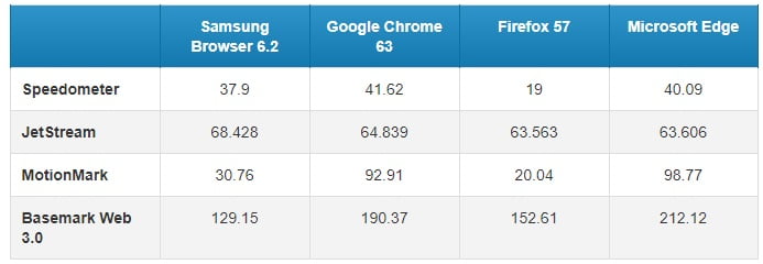 مرورگرها در جدیدترین نسخه سامسونگ 6.2، مرورگر کروم نسخه 63، فایرفاکس 57 و نسخه اولیه Edge مورد آزمایش قرار گرفتند و در تصاویر پایین می توانید نتایج حاصل از عملکرد آنها در 4 بنچمارک معرفی شده، مشاهده فرمایید.