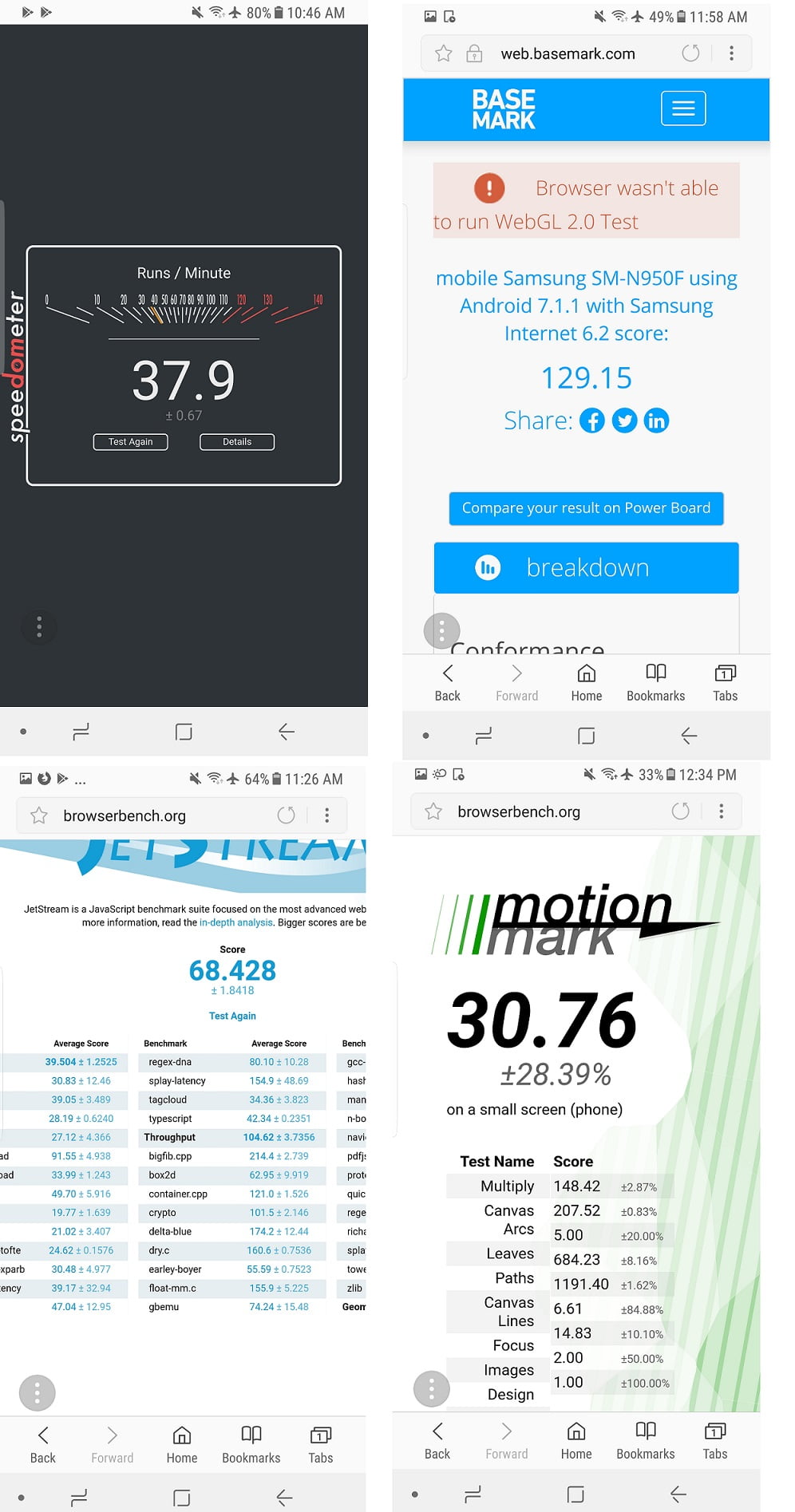 تا همین چندی قبل در خصوص انتخاب مرورگرهای موبایل، قدرت انتخاب چندانی نداشتیم، اما پس از مرورگرهای فایرفاکس و مایکروسافت وارد بازی شدند، اوضاع رقابت کمی تغییر کرد. مرورگرهای کروم و سامسونگ هم با به روزرسانی کیفیت ارائه خدمات خود را بالاتر بردند. برای اینکه بدانیم کدامیک از این مرورگرها عملکرد سریعتری دارند، با چند بنچمارک ترکیبی عملکرد آنها بر روی یک گوشی گلکسی نوت 8 مورد آزمایش قرار گرفت. این تست با 4 بنچمارک انجام شد: