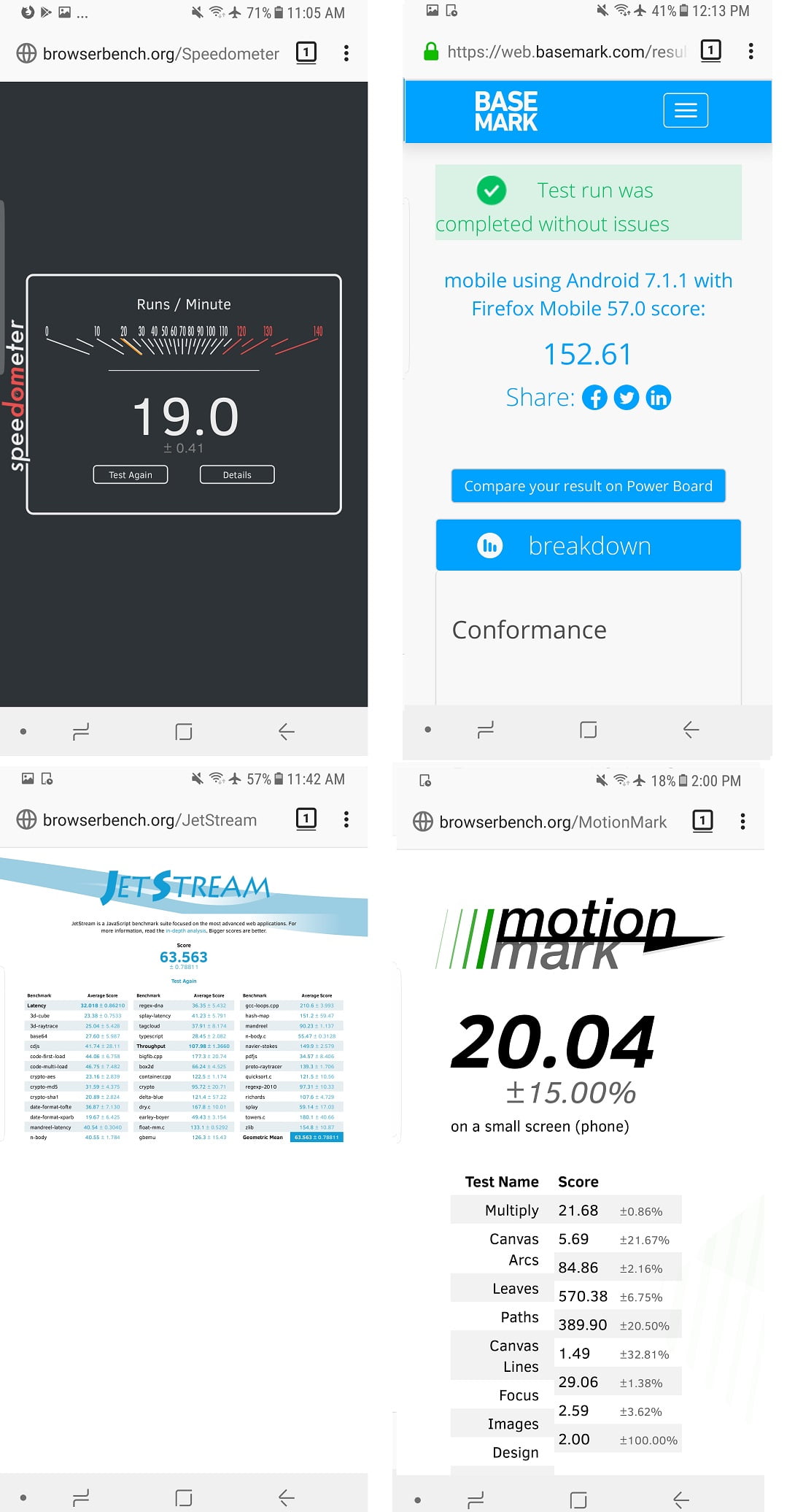 Speedometer: برای محاسبه سرعت پاسخگویی مرورگر در سایت های معمول، JetStream: این بنچمارک به بررسی عملکرد مرورگرها در وب سایت های پیشرفته تر، MotionMark: بنچمارک گرافیکی و Basemark Web 3.0: برای پلتفرم های شخص ثالث.