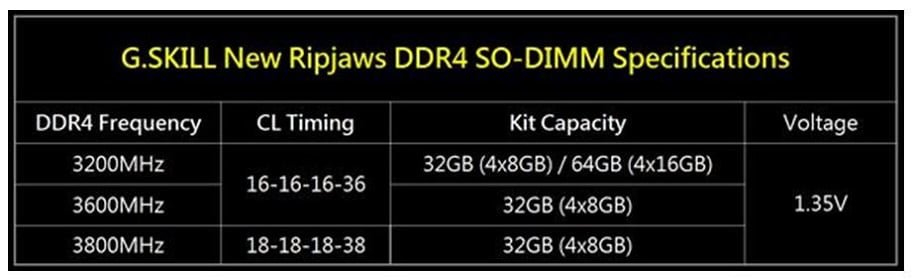 در نهایت جی اسکیل سریع ترین ماژول های SO-DIMM را معرفی کرده است که مجموع 32 گیگابایت حافظه DDR4 را با تایمینگ CL18-18-18-38 عرضه می کنند. افزون بر این کیت، جی اسکیل تصمیم به ارائه کیت های DDR4-3600 MHz CL16-16-16-36، کیت DDR4-3200 MHz CL16-16-16-36 و DDR4-3200 MHz CL16-16-16-36 را گرفته است که کیت آخر در ظرفیت 64 گیگابایت راهی بازار خواهد شد. ماژول های جدید جی اسکیل از تراشه های Samsung B-die DDR4 بهره می برند.