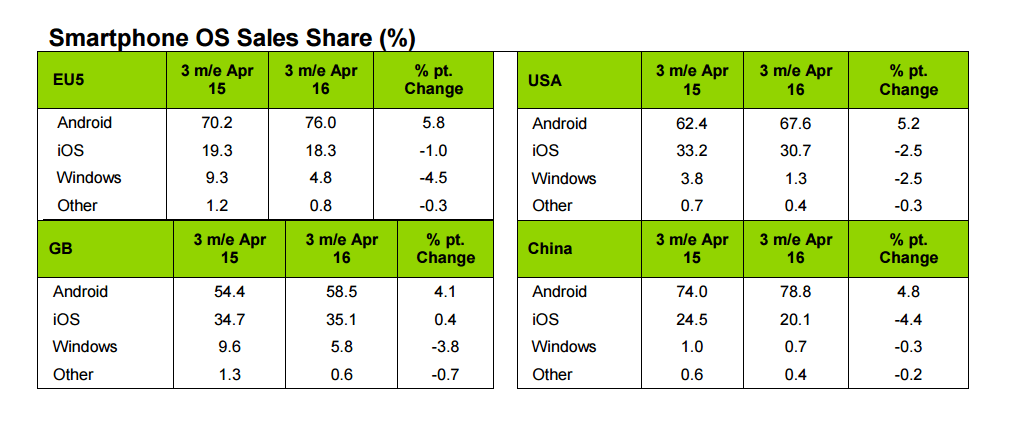 اما در حالی که رشد اندروید ادامه داشته است که بیشتر به واسطه ی افت سهم ویندوزفون بوده است، در سوی دیگر iOS اپل نیز در حال از دست دادن سهم خود در بازار گوشی های موبایل است. در 5 کشور اروپایی ذکر شده، اپل یک در صد از سهم خود را از دست داده است و سهم این پلتفرم در این مناطق به 18.3 در صد رسیده است. در چین هم iOSکاهش 4.4 در صدی را تجربه کرده است و به رقم 20.1 در صد دست یافته است. اما مهم ترین قسمت این است که حتی در امریکا هم این داستان برای این پلتفرم بر قرار است. iOS در امریکا 2.5 در صد از سهم خود را از ماه آوریل تاکنون از دست داده است و 30.7 در صد از سهم بازار امریکا را در اختیار دارد. در حالی که به عقیده ی برخی، اندروید سیستم عاملی اشباع شده است، شاهد این هستیم که چگونه رشد این سیستم عامل همچنان ادامه دارد. به نظر میرسد اندروید قصد دارد تا به طور کامل رقبا را از صحنه خارج کند. به نظر شما این اتفاق خوبی به شمار میرود؟ نظر شما در این خصوص چیست؟
