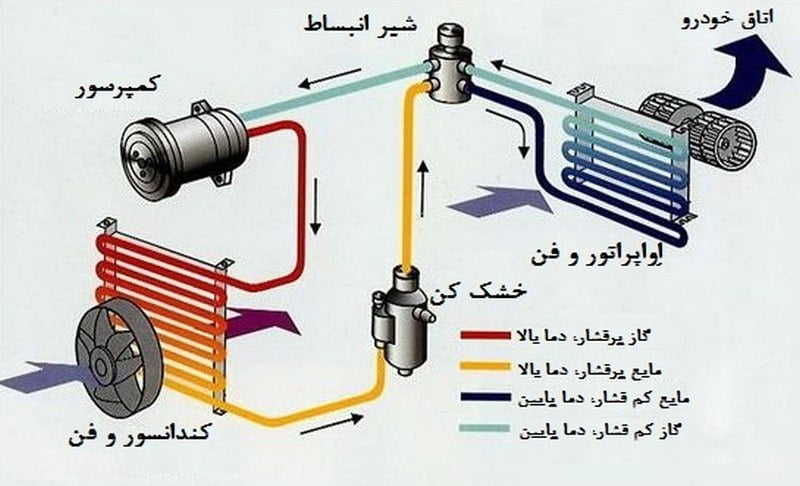 مرحله پنجم: حال مایع کم فشار و سرد به “اِواپراتور” میرسد، ( اِواپراتور قطعه ای شبیه به رادیاتور است که لوله ای مارپیچ از میان پره های عمودی عبور کرده ) در این مرحله فن ها با پرتاب هوا از بین پره های اِواپراتور، موجب میشوند تا هوای خنک وارد اتاق خودرو شود، سیال پس از عبور از اِواپراتور گرم میشود و با عبور دوباره از شیر انبساط ( این بار تغییری در آن رخ نمیدهد ) به کمپرسور برمیگردد و این چرخه دوباره ادامه میابد.