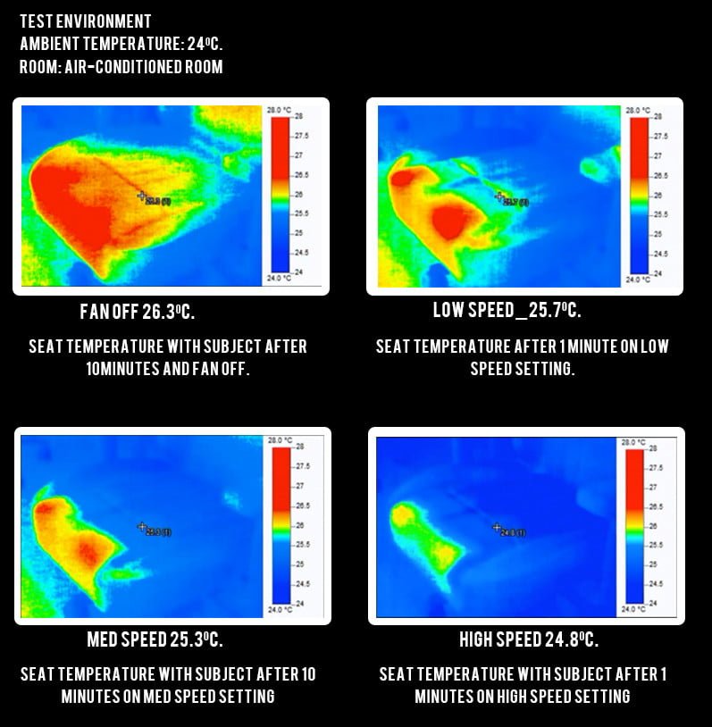 این صندلی ضمن آنکه مانع از عرق کردن بدن در نشست های طولانی می گردد، می تواند دمای کلی را بین 0.6 الی 1.5 درجه سانتی گراد کاهش دهد. نویز صوتی فن ها حداکثر 32 دسیبل اعلام گشته اما از سرعت آنها اطلاعی در دست نیست. با این وجود یک مدار کنترلر با 3 وضعیت سرعت در قسمت پشت صندلی تعبیه شده است که امکان انتخاب وضعیت های خاموش/روشن و 3 سرعت متفاوت را در اختیار کاربران قرار خواهد داد.