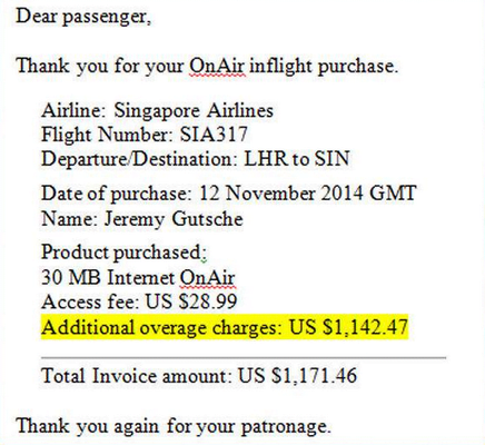 البته این استفاده دلپذیر اگر همراه با یک صورتحساب شوک آور باشد، مسلما به یک کابوس تمام معنا تبدیل خواهد شد! این اتفاقی دردآور است که برای جرمی گاتچ اتفاق افتاده است. این مسافر که از لندن عازم سنگاپور بوده است، با صورتحساب 1171 دلاری برای استفاده کردن از اینترنت Wi-Fi هواپیما مواجه شده است که به قول خودش نزدیک بوده است پا به فرار بگذارد!(اگر خود من هم بودم فرار میکردم!). بر اساس قوانین خطوط پروازی سنگاپور، شما با پرداخت تقریبا 29 دلار از خدمات اینترنتی با حجم 30 مگابایت در طی پرواز برخوردارید. حالا این مسافر مدعی است که اینترنت بسیار بسیار کند بوده است و حتی صفحات ایمیل را به سختی باز میکرده است و امکان دیدن فیلم هم میسر نبوده است که این مبلغ منطقی به نظر برسد. به هر صورت 1171 دلار از جیب این مسافر رفت تا بقیه مسافران با وسواس بیشتری به سراغ خدماتی که قرار است جهت جلب رضایت مسافران باشد ، نزدیک شوند.