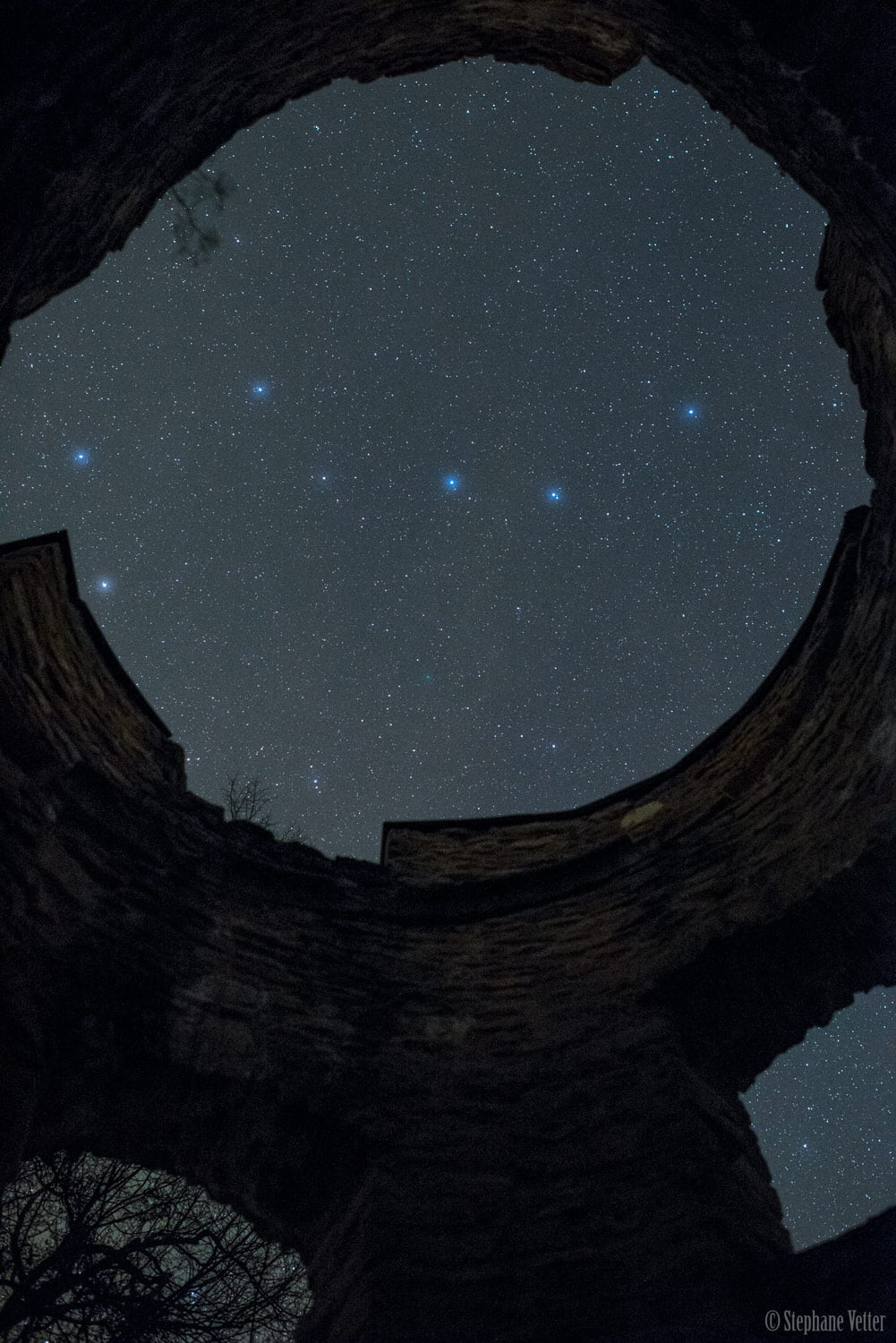 شناخته شده ترین ستاره ها آسمان شمالی، دب اکبر با عظمت به راحتی قابل شناسایی است، حتی زمانیکه به صورت وارونه به آنها نگاه کنید، هرچند ممکن است به صورت یک گاوه آهن دیده شوند. ستاره های معروف و خطوط آشنای بین آنها در قاب دیوارهای برج خرابه ای در فرانسه به نام Chateau du Morimont جای گرفته اند. دبه (Dubhe)، ستاره آلفا در صورت فلکی دب اکبر در سمت چپ پایین قرار دارد. همراه با ستاره بتا، مراق به دو سمت ستاره قطبی و قطب سماوی شمال که از دیدگاه سنگ های قلعه پنهان است، اشاره دارند. از آنجا که این تصویر در 30 مارس گرفته شده است، شما می توانید خط را از ستاره های گاما (Phecda) و دلتا (Megrez) دب اکبر را دنبال کنید تا به درخشش سبزرنگی از ستاره دنباله دار 41P/Tuttle-Giacobini-Kresak، پایین تر از مرکز عکس برسید. این دنباله دار دوره ای در 1 آپریل با جهشی قابل توجه به سیاره زمین نزدیک شده است.