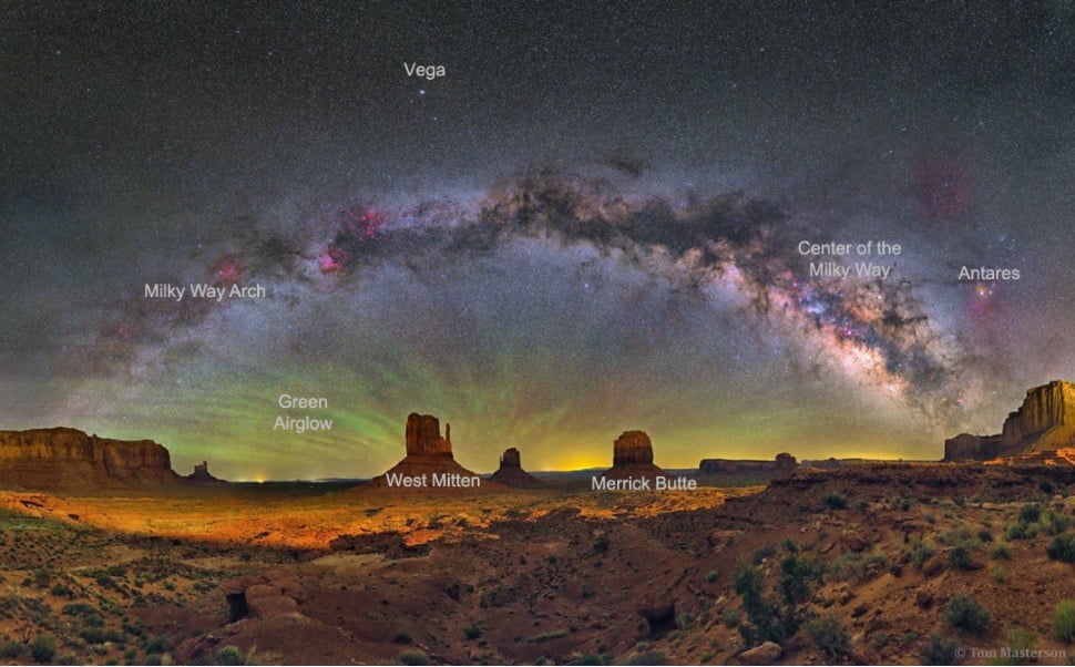 نیازی نیست که برای دیدن قوس کهکشان شیری در آسمان به دره یادبود سفر کنید، اما مسلماً با حضور در آنجا زیبایی بیشتری را شکار خواهید کرد. چرا که فقط در دره یادبود (Monument Valley) آمریکا می توانید این پیش زمینه زیبا که شامل قله های سنگی است که به آنها تپه (Buttes) گفته می شود، را مشاهده کنید. این تپه ها از سنگ های سختی که بعد از خالی شدن آب در سنگ های نرم و تخریب آنها تشکیل شده اند، بوجود آمده است. در این تصویر که در سال 2012 گرفته شده است، تپه نزدیک سمت چپی به همراه تپهی سمت راست آن، Mittens نام دارند و تپه سمت راست که دورتر از آنها قرار گرفته Merrick Butte است. تابش سبزرنگی ناشی از تابش اتمسفربالا در آسمان شب، در افق قابل مشاهده است. کمی بالاتر، یک باند نوری وجود دارد، که باند مرکزی کهکشان راه شیری است. این باند نوری را تقریباً هر کسی میتواند در آسمان صاف شب و زمانیکه به اندازه کافی از شهر و نورهای روشن اطراف آن فاصله گرفته است، مشاهده کند. اما برای ثبت چنین تصویری با این رنگ ها در آسمان تاریک شب، به یک دوربین دیجیتال حساس نیاز است.