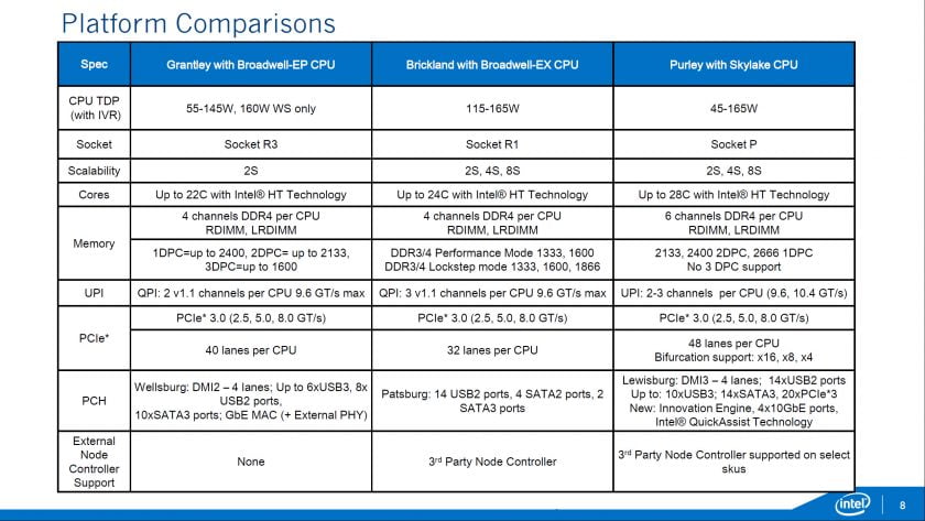 8 سوکت می تواند در یک پلتفرم مورد استفاده قرار گیرد که توان پردازشی غیر قابل وصفی را اداره می کند. Skylake EX Purley ها را می توان مقیاس پذیر پردازنده های موجود دانست که برای اولین بار از 48 مسیر PCI پشتیبانی کرده و در پیکربندی های X4,X8 و X16 آنها را اجرا می کند. توان حرارتی (TDP) آنها به 165 وات می رسد و از 12 اسلات رم DDR4 نیز پشتیبانی خواهد کرد. در حاضر قیمت و تاریخ دقیق عرضه این پلتفرم مشخص نشده است.