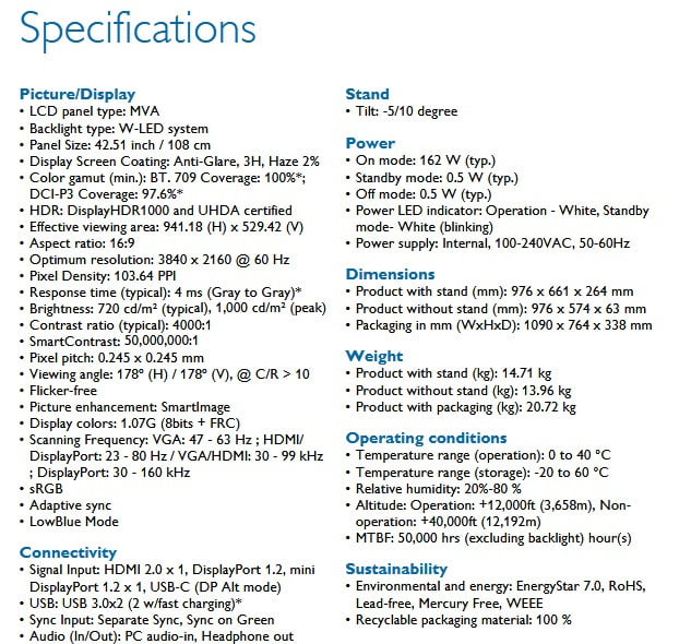 مانیتور Philips 436M6VBPAB با پشتیبانی از فناوری HDR، امکان ارائه 1000 نیت را فراهم ساخته و این در حالی است که اوج نور در بسیاری از مانیتورهای امروزی به نهایت 400 نیت می رسد. محصول زیبای هلندی ها از فناوری Active Sync نیز بهره برده و همانطور که پیشبینی می شد، به دلیل ابعاد بزرگ پنل، فرکانس صفحه به 60 هرتز می رسد. این مانیتور ترکیبی از پنل 8 بیت به همراه FRC است که آن را تا 10 بیت گسترش داده و به همین علت می تواند گستره رنگ DCI-P3 را تا 9706% پوشش دهد که به واقع رقم بالایی محسوب می گردد. علاوه بر ورودی های HDMI 2.0, Displayport 1.2 و mini DisplayPort، این مانیتور به یک درگاه USB-C نیز مجهز شده است. تاریخ نهایی لانچ و قیمت گذاری Philips 436M6VBPAB هنوز مشخص نشده است.