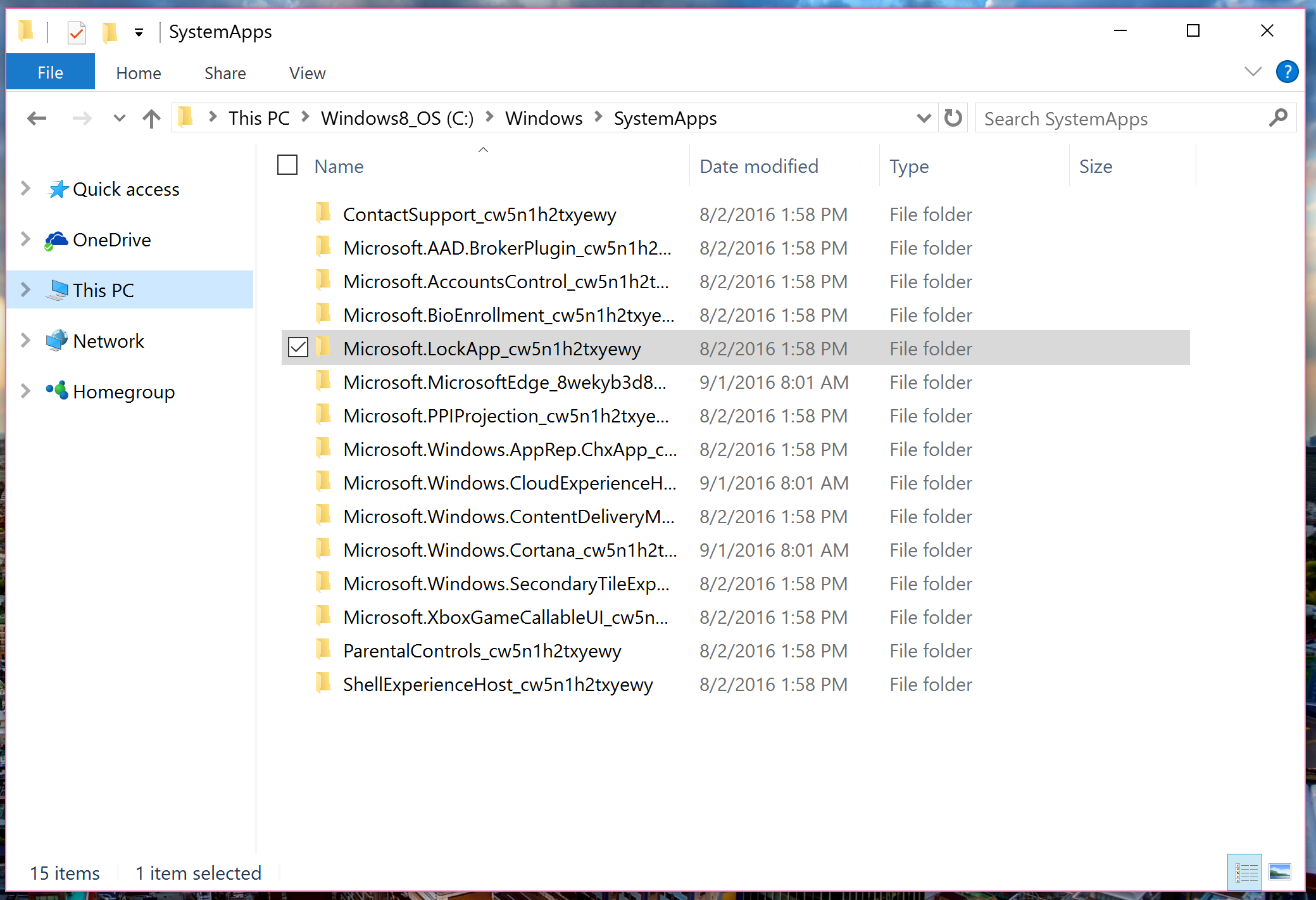 راه های مختلفی برای انجام این کار وجود دارد اما ساده ترین روش غیر فعال کردن پوشه LockApp می باشد. بدین منظور File Explorer را باز کرده و به مسیر c>windows>systemapps رفته و پوشه Microsoft.LockApp_cw5n1h2txyew را پیدا کنید.بر روی پوشه راست کلیک کرده و در انتهای نام آن bak. را اضافه کرده سپس تغییر نام را با enter تایید کنید. ممکن است برای انجام این تغییر نیاز به دسترسی به سطح ادمین را داشته باشید در صورت مشاهده پنجره با این موضوع بر روی continue کلیک کنید.