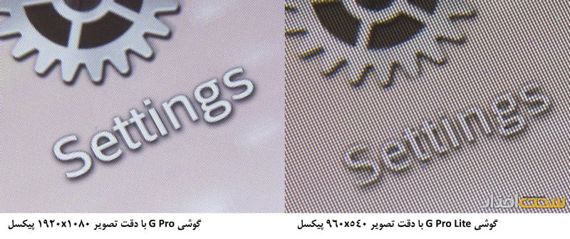 نمای میکروسکوپی صفحهنمایش این گوشی در تصویر به خوبی نمایان است. همچنین در تصویر میتوانید تفاوت نمایش متن در صفحهنمایش G Pro و G Pro Lite Dual را مشاهده نمایید. با این حال استفاده از پانل IPS باعث شده تا زاویه دید مناسب باشد، اما از بابت درجهبندی این پانل از بابت کیفیت نمایش رنگها، باید گفت که این پانل IPS یک درجه پایین تر از پانلی است که در G Pro به کار گرفته شده است. محدودیت دیگر در بخش صفحهنمایش که تا حدودی عجیب به نظر میرسد، حذف سنسور تشخیص نور محیط (برای تنظیم خودکار شدت نور صفحهنمایش) است که حتی بسیاری از گوشی های میان قیمت 500 هزار تومانی هم به آن مجهز هستند! این صفحهنمایش در برابر باقی ماندن اثر انگشت نسبتاً مقاوم است، اما مشخص نیست که این صفحهنمایش به روکش مقاوم در برابر خط و خش مجهز شده یا خیر. الجی قابلیت Knock On (دو بار ضربه روی صفحهنمایش برای روشن و خاموش شدن صفحهنمایش) در نظر گرفته است که البته فاقد حساسیت و کارایی مشابه با گوشی LG G2 است (امیدواریم الجی در بهروز رسانی های آینده این نقیصه را برطرف کند).
