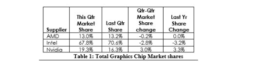 همچنین APU های کلاس لپ تاپ AMD نیز با رشد 2.2% و کارت گرافیک های کلاس دسکتاپ نیز 16.1% رشد را نشان داده اند. کارت گرافیک های کلاس لپ تاپ که توسط AMD به تولید و فروش رسیده اند نیز 5.2% رشد داشته اند. با احتساب این آمار، فروش بخش پردازنده های گرافیکی AMD با رشد 7.6% روبرو بوده است. و اما سهم اینتل از این بازار چقدر بوده است؟ کمپانی Intel که البته به طور تخصصی در این زمینه فعال نکرده و فاقد تراشه های گرافیکی مجزا در قالب کارت گرافیک است، در بخش دسکتاپ شاهد رشد 5.0% بوده است. در بخش لپ تاپ اینتل موفق به کسب رشد 5.9% گشته و به طور کلی این شرکت نیز در این فصل به رشد 5.0% در این زمینه دست یافته است.