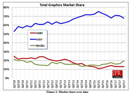 کدام برند بیشترین کارت گرافیک و تراشه های گرافیکی را راهی بازار کرده است؟ سه ماهه پیشین سال 2017 و یا به عبارت ساده تر آخرین فصل از بازار، حاکی از رشد و فروش تراشه های گرافیکی در مدل های مجتمع و مجزا است. این در حالی است که بخش گیمینگ همچنان بیشترین مصرف کننده در این حوزه باقی مانده است. به گزارش موسسه JPR فروش تراشه و انواع کارت گرافیک در این فصل با رشد 9.3 درصدی روبرو بوده است. کمپانی AMD با 8% و NVIDIA نیز 30% درصد از سهم بازار را در این رشد، در اختیار گرفته اند. این گزارش که به فروش پردازنده های گرافیکی در 3 ماهه سوم و پایانی سال 2017 می پردازد، هر 3 برند انویدیا، اینتل و ای ام دی را مورد بررسی قرار داده است.