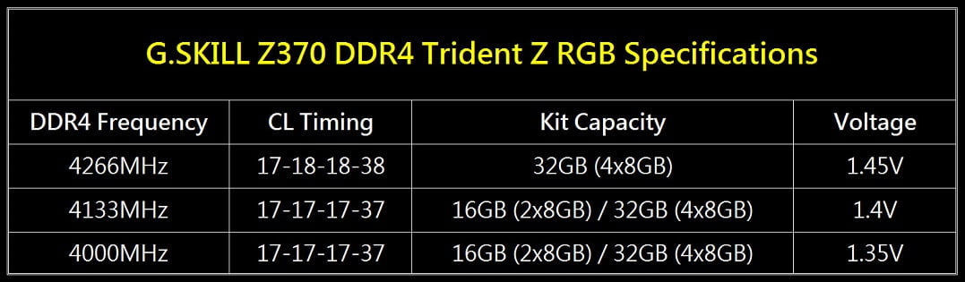 کیت سوم که در ظرفیت 32 گیگابایت تولید می گردد، دارای مشخصات DDR4-4266MHz CL17-18-18-38 بوده و ولتاژ 1.45 ولت را طلب می کند. به مانند گذشته، G.Skill نتایج اولین آزمون های تست را منتشر کرده است که مادربرد ASUS ROG MAXIMUS X HERO در کنار پردازنده Intel Core i7-8700K از این کیت ها استفاده خواهند کرد. علاوه بر تامینیگ پایین، کیت های جدید از پروفایل Intel XMP 2.0 و قابلیت های اورکلاک تخصصی نیز پشتیبانی به عمل می آورند. در ماه ژانویه 2018 شاهد ورود DDR4 های جدید جی اسکیل به بازار هستیم.
