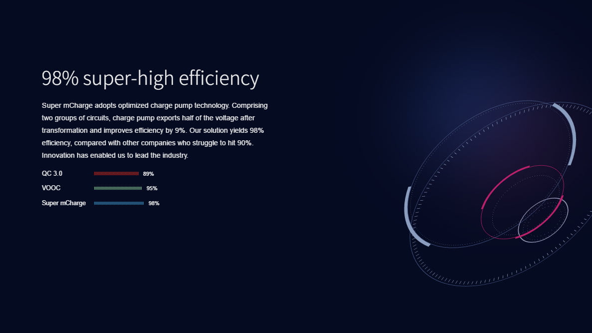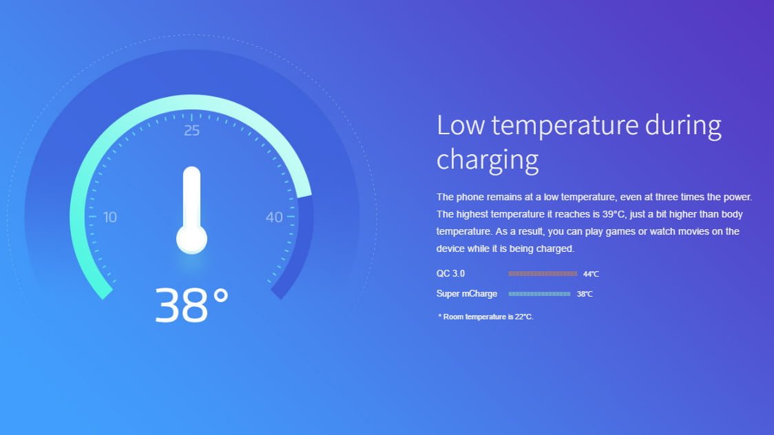 Super mCharge چهارمین نسل از فناوری شارژ میزو است که این بار به ولتاژ بالا و سیستم انتقال مستقیم جریان برق مجهز شده است. بر اساس اطلاعات منتشر شده از سوی کمپانی میزو، شارژر سازگار با این فناوری با جریان 11V/5A فعالیت میکند و میتواند انرژی را با قدرت 55 وات منتقل کند که عدد خیره کننده ای است. به منظور مقایسه، فناوری توربو شارژر موتورولا و VOOC اوپو انرژی را با قدرت 25 وات منتقل میکند. به لطف کابل ارتقا یافته ی میزو، انتقال جریان الکتریسیته تا 160 وات نیز میتواند افزایش پیدا کند و امکان فعالیت با جریان 20V/8A نیز میسر است. اولین و مهم ترین سوالی که پس از دیدن این اعداد و ارقام در ذهن کاربر پیش میآید این است که آیا این فناوری باعث ذوب شدن دستگاه در حال شارژ نمیشود و از ایمنی کافی برخوردار است؟ میزو میگوید که Super mCharge جدید تنها از 2 گروه از مدارهای مبدل استفاده میکند که باعث بهبود 9 درصدی فرآیند شارژ نسبت به نسل قبل این فناوری میشود و اکنون راندمان Super mCharge به 98 درصد رسیده است.