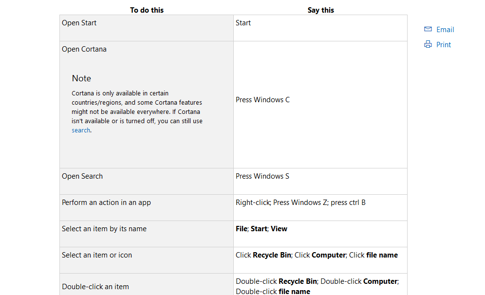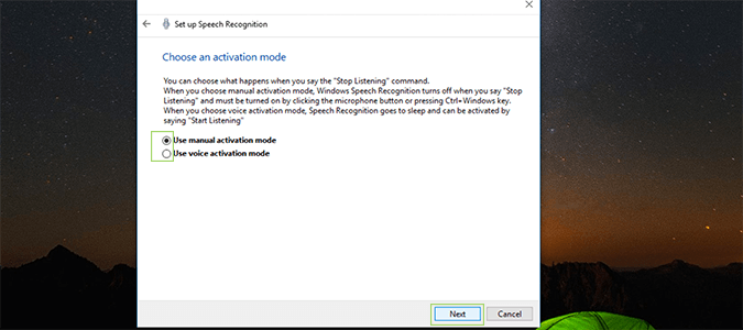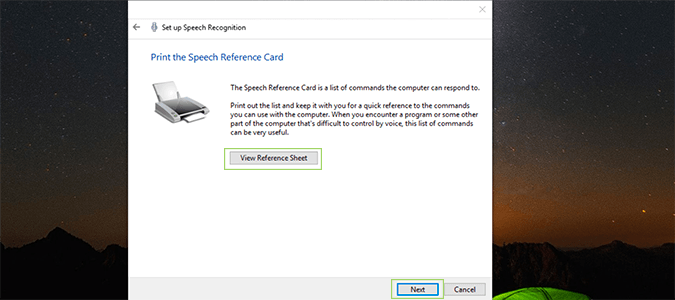 در پنجره ی بعد باید حالت فعال سازی این قابلیت را انتخاب کنید و در نهایت بر روی Next کلیک نمایید. سپس پنجره ی جدیدی باز می شود که عبارات مختلف برای اجرای عملیات مختلف توسط صدای شما را در اختیارتان قرار می دهد و درخواست می کند که آن را پرینت کنید و در اختیار داشته باشید.