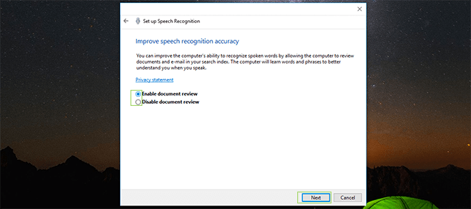 پس از پایان مرحله ی تشخیص گفتار پنجره ی جدیدی نمایش داده خواهد که با انتخاب گزینه ی Enable document review، کلمات و عباراتی در اختیارتان قرار خواهد گرفت که به درک بهتر کامپیوتر کمک خواهد کرد.