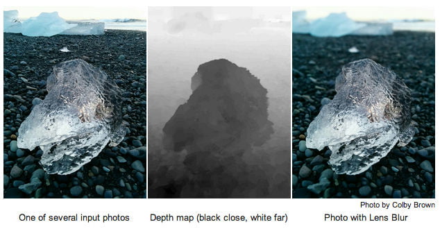 ویژگی Lens Blur نه تنها می تواند پس زمینه را محو کند، بلکه پس از ثبت عکس می توانید میزان محو شدگی را تغییر داده و حتی نقطه فوکوس خود را تغییر دهید. برای انجام این کار شما باید پس از ثبت اولین عکس دوربین را کمی به سمت بالا حرکت داده تا مجموعه از عکس ثبت شده و مدلی سه بعدی از سوژه و محیط اطراف آن بدست آید (تصویر سیاه و سفید الگویی از میزان عمق تصویر نشان میدهد که نقاط تیره تر نشان دهنده نزدیک تر بودن آن به دوربین است). این سیستم دقیقاً همان حالتی را ایجاد میکند که چشم انسان یا دو دوربین موجود در گوشی HTC One M8 برای دیدن اشیا به کار می برند. با این تفاوت که گوگل از الگوریتم های مختلف و مقایسه میزان تفاوت رنگی بین پیکسل ها و تفاوت مکانی آنها این عمل را انجام میدهد.