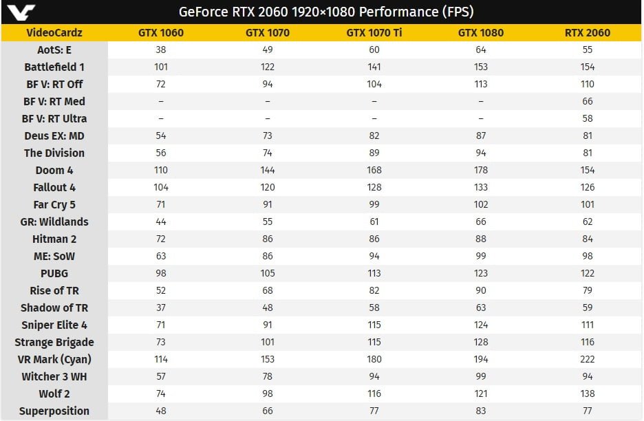 اگر فناوری های Real Time Ray Tracking را کنار بگذاریم، انویدیا ادعا می کند که این محصول پرفورمنسی به اندازه کارت گرافیک GeForce GTX 1070 Ti را ارائه می دهد که با این قیمت، به طور حتم ارزش خرید بالاتری خواهد داشت. این محصول در بازی Battlefield V مورد بررسی قرار گرفته و با دقت 1080p، در 3 حالت بررسی شده است که نتایج نرخ فریم آن را در پایین مشاهده خواهید کرد: