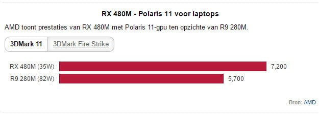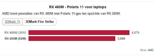 اینبار AMD نیز با اضافه کردن نام M به پایان نام اصلی کارت گرافیک RX480،یک مدل جدید برای لپ تاپ ها را ایجاد کرده است.این کارت گرافیک از معماری ستاره قطبی 11 استفاده می کند.P11 به طور معمول در کارت گرافیک های میان رده-متوسط مورد استفاده قرار می گیرد.RX480M دارای توان حرارتی 35 وات است که یک جهش بزرگ در این زمینه محسوب می گردد.این در حالی است که توان حرارتی کارت گرافیک R9 280M برابر با 82 وات است.با وجود کاهش توان حرارتی RX480 و همچنین بهبود پرفورمنس در آن،اما تفاوت چندانی در این بنچمارک به چشم نمی خورد.