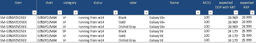 در تصویری که Android Headlines به دست آورده عنوان شده است که گلکسی های جدید در سه رنگ مشکی، طلایی و خاکستری عرضه خواهند شد. همچنین از نظر قیمت مشخص شده که قیمت گلکسی اس 8 در نسخه پایه 950 دلار (3 میلیون و هفتصد هزار تومان) و قیمت گلکسی اس 8 پلاس 1050 دلار (4 میلیون و 100 هزار تومان) تعیین شده اند. البته این وب سایت توضیح داده است که قیمت ها متعلق به یک فروشگاه آنلاین اکراینی هستند و ممکن است قیمت های رسمی برای عرضه مستقیم گوشی ها کمی پایین تر از این اعداد باشند. البته پیشتر هم گفته شده بود که S8 و S8 Plus گران تر از S7 و مدل خمیده آن خواهند بود و حتی شایعه شده بود مدل پلاس قیمتی 1000 دلاری خواهد داشت.