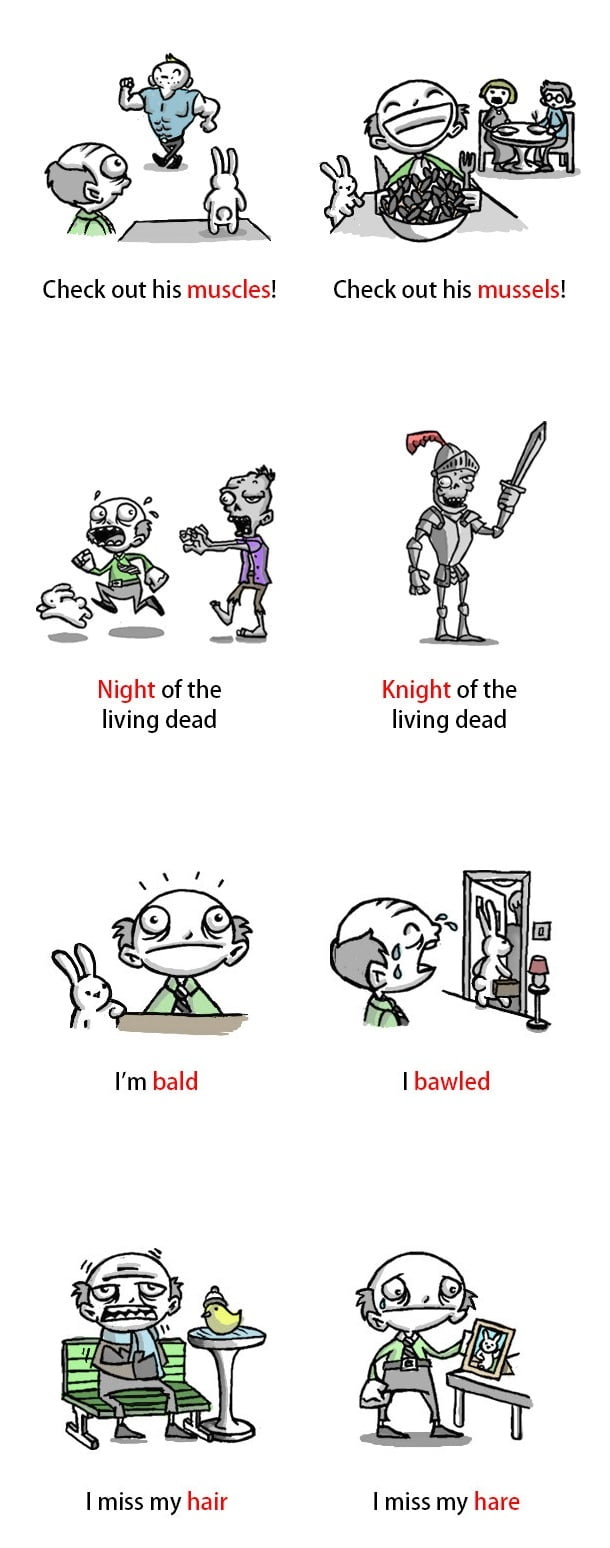تلفظ این کلمات به قدری شبیه به هم است که برای تشخیص آن ها یا باید یک انگلیسی زبان بومی باشید یا اینکه با توجه به جمله معنی آن را حدس بزنید.در زیر تعدادی از کلمات به اصطلاح homophone را می بینید.