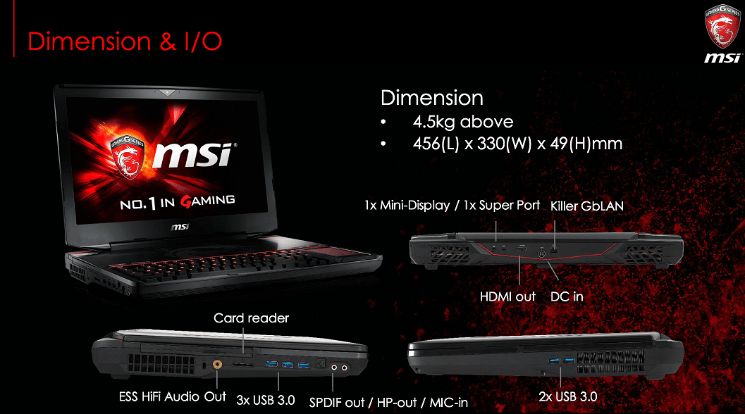 سری GT80S این برند دارای قدرتمند ترین نوت بوک های MSI هستند.حداکثر توان پردازشی برای این سری در نظر گرفته شده است. GT80S 6QF (TITAN SLI) 075UK یکی از جدید ترین نوت بوک های سری GT80S است که از پردازنده مدرن و نسل ششمی اینتل یعنی i7-6920HQ استفاده می کند.این پردازنده فرکانسی در رنج 2.9~3.8 گیگاهرتز را در کنار 4 هسته و 8 رشته پردازشی محیا می کند.نمایشگر 18.4 اینچی این محصول از یک پنل IPS با دقت FHD و کاهنده نورهای آبی مضر برخوردار است.GT80S قادر به ارائه همزمان تصویر در 4 مانیتور است که از خروجی های متعدد آن می توان اعتماد به نفس MSI را درک کرد.نکته جالب توجه نیز خروجی 4K از طریق پورت های جانبی است.این نوت بوک زیبا دارای یک صفحه کلید مکانیکی SteelSeries است و نور زمینه آن نیز قابل تنظیم است.فضای پهناور بالای کیبورد و همچنین پد لمسی چند کاره در سمت راست آن قابل مشاهده است.به لطف استفاده از متریال های فلزی در بدنه و همچنین خنک کننده مقتدر،دما از محل یوزر به عقب مکیده و در اگزوزهای عقب خارج می گردد.